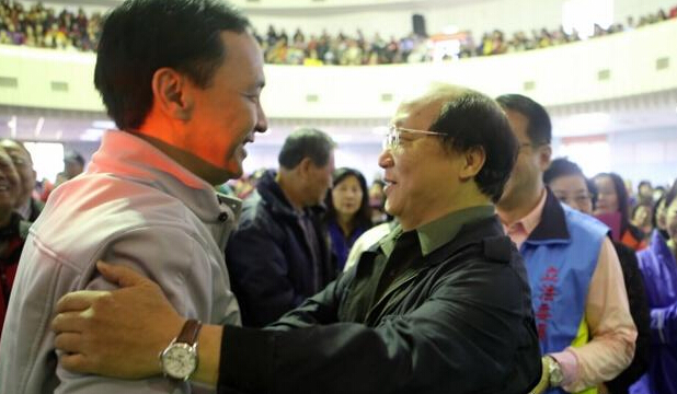 國民黨主席候選人朱立倫到臺中政見發表會,副主席胡志強獻上大大擁抱。中評社