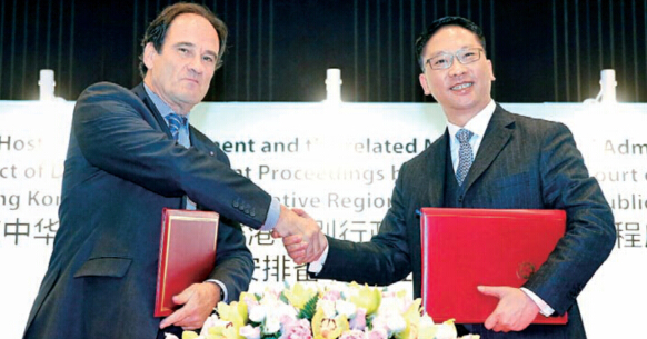 袁國強(右)代表香港特區政府與常設仲裁法院秘書長雨果·漢斯·斯布勒斯簽署相關行政安排備忘錄。