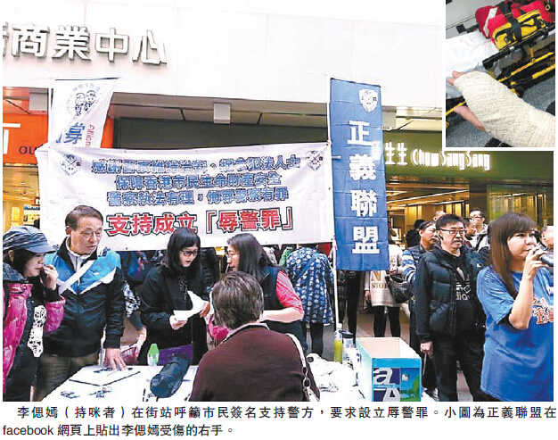 「正義聯盟」、「撐警大聯盟」昨午於旺角行人專用區舉辦簽名行動,表達支持警方於「占領」行動執法,同時要求政府要設立辱警罪。兩團體召集人李偲嫣表示,經歷79天的違法「占領」行動,期間警方克盡己職,忍辱負重,卻受盡反對派的無理辱罵,亦飽受激進人士騷擾,此等行為難免影響市民。聯盟將一連十四個星期,到本港不同地區收集市民簽名,爭取各方支持設立辱警罪。行動完成后,會將簽名及建議遞給行政長官梁振英。