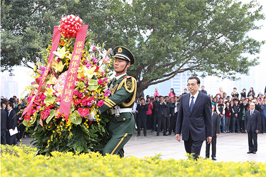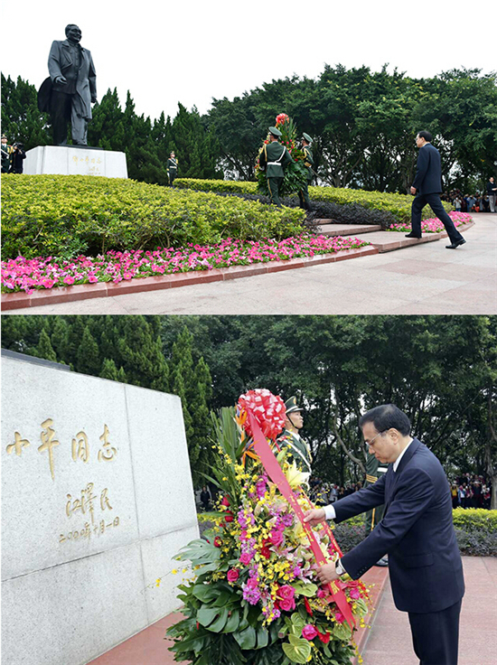 在廣東省和深圳市官员及部分老同志的陪同下,李克强总理和自發到現場的群眾一起向鄧小平銅像敬獻花籃。