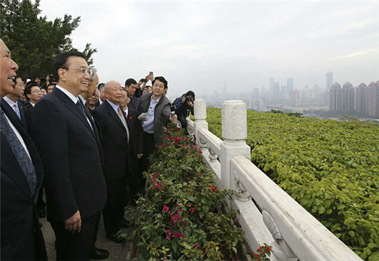 敬獻花籃儀式后,李克強在群眾圍攏下與當年陪同小平“南巡”的部分老同志遠眺深圳城區,回憶“南巡”場景,共話改革開放。時任深圳市委書記的李灝和時任珠海市委書記的梁廣大滔滔不絕地說了起來。