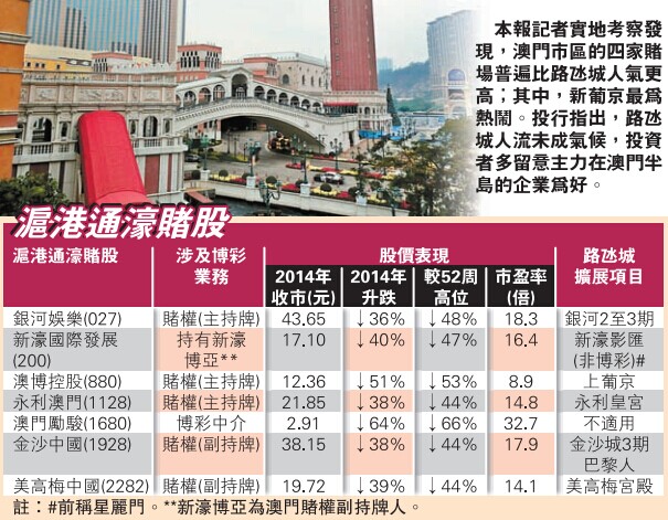 澳門博彩股去年遭拋售,滬港通涵蓋的7隻澳門博彩股全年跌幅悉數超逾三成半,大幅跑輸恒指同期的1%升幅。踏入2015年,澳門博彩毛收疲弱趨勢能否扭轉惹人關注,本報記者走訪澳門8間賭場,了解各賭場「中場」的業務狀況,以供投資者參考。香港商報記者 陳輝
