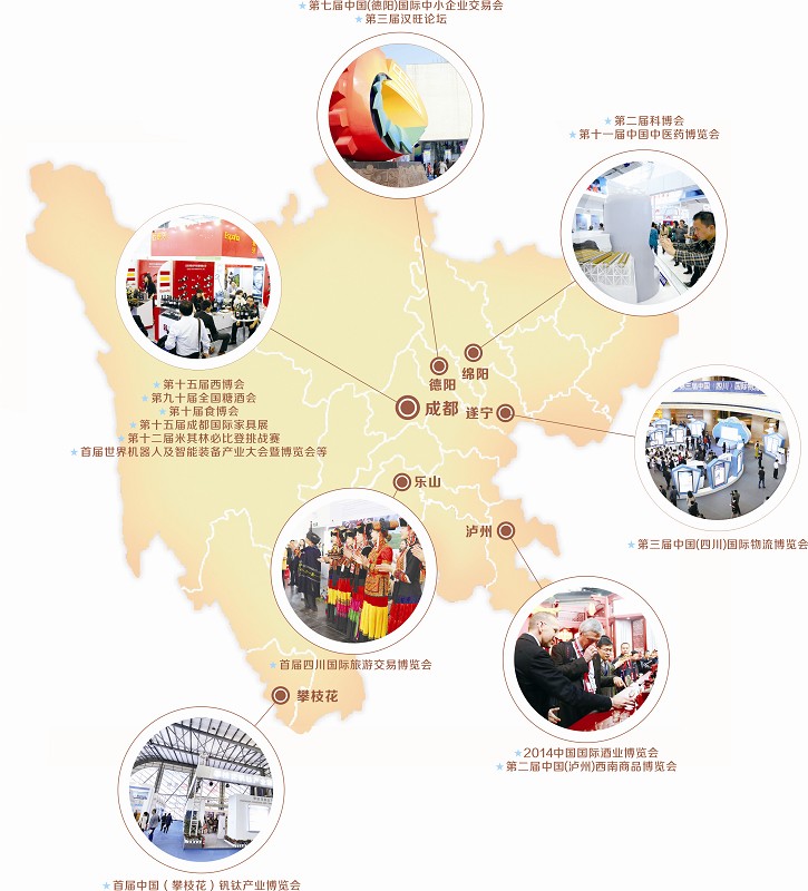 2014年,四川省會展業打了一場場漂亮仗:西博會、糖酒會、科博會、酒博會、釩鈦產業博覽會……一個又一個重大展會活動悉數圓滿落幕。