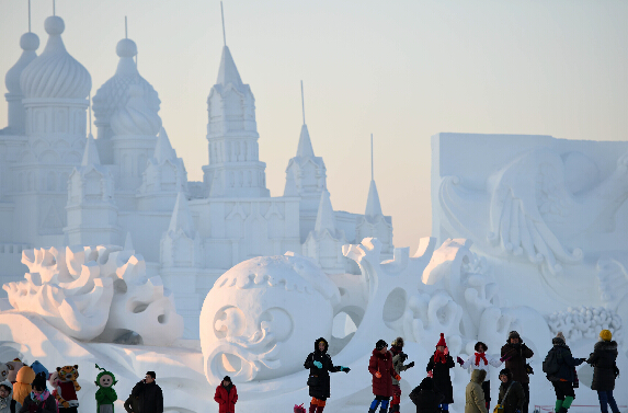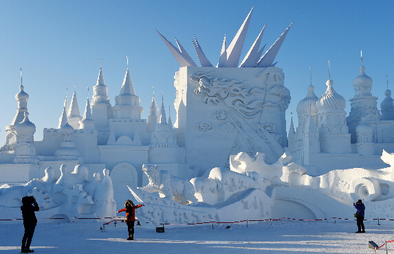 1月6日,游客在太陽島雪博會主塑《綻放》前游玩拍照。