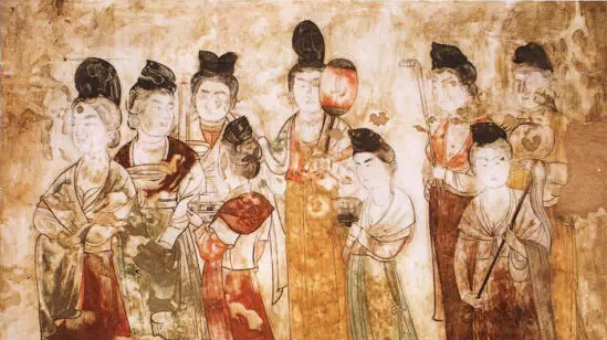 那唐代美女什麼時候流行袒胸呢?武則天和唐高宗李治的孫女永泰公主,在大足元年(701)死去。她墓中留下了很精美的壁畫,上面的美人裝束是這樣的:
