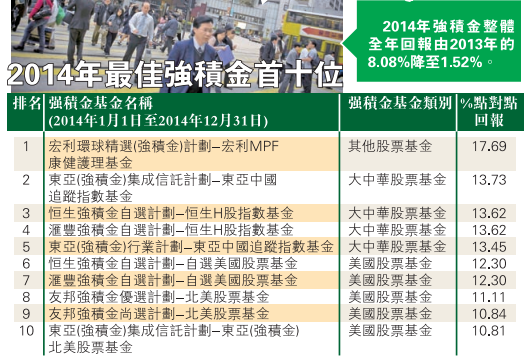 個別基金方面,股票基金包攬去年基金表現十佳排行榜,首三位依次為宏利康健護理基金、東亞中國追蹤指數基金及恒生H股指數基金,分別錄得17.69%、13.73%及13.62%的回報。