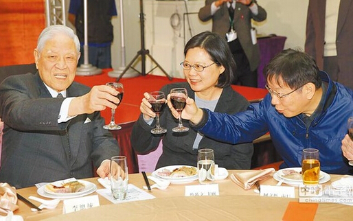 李登輝(左)、蔡英文(中)及柯文哲(右)三人共同出席餐會,并一同舉杯祝新年快樂。(圖片來自臺媒)