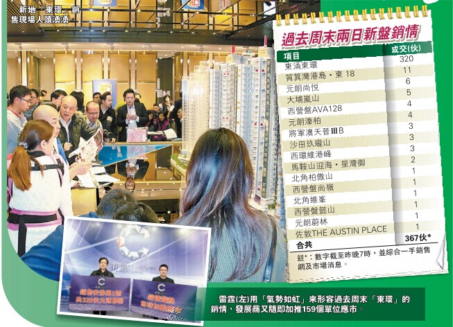 【香港商報網訊】記者劉家麗報道:新一份施政報告發表在即,本港新盤市場繼續保持暢旺。其中,焦點新盤東涌「東環」於過去周六發售第二批320個單位,即日已獲全數沽清,撐起過去周末新盤交投。綜合一手銷售網及市場消息,截至昨晚7時,過去周末兩日合共錄約367宗一手新盤成交,按周微升8%。
