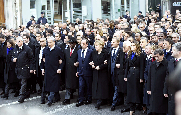 1月11日,在法國巴黎,法國總統奧朗德、德國總理默克爾、意大利總理倫齊等政要參加反恐大游行。