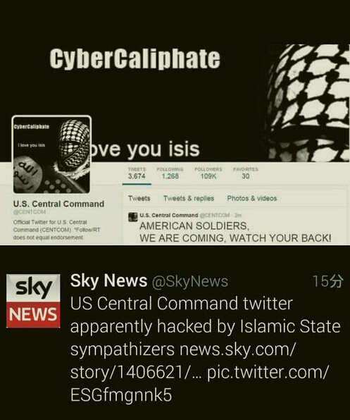 美軍中央司令部的官方推特帳號,以及YouTube帳號12號遭到疑為支持伊斯蘭國組織的黑客入侵。五角大樓證實,兩個帳號受黑客攻擊,但稱此事并沒有構成安全威脅。
