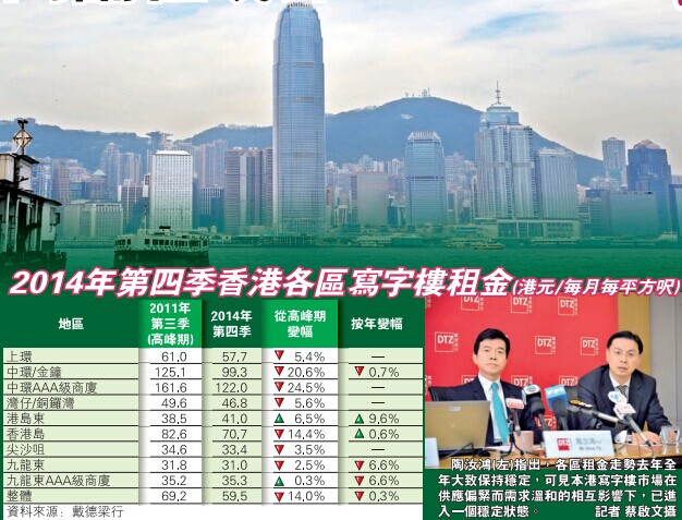 該行香港區董事總經理暨北亞區策略發展顧問部主管陶汝鴻於記者會表示,上季有私募基金、內地券商及擬來港上市公司等,簽下中環/金鐘區寫字樓的租約,這些行業的公司仍以該區為設立辦事處的首選地。他稱:「季內有較多這類小規模的租賃,紓緩了空置率上升所帶來的壓力,令租金受到的衝擊也較小。」