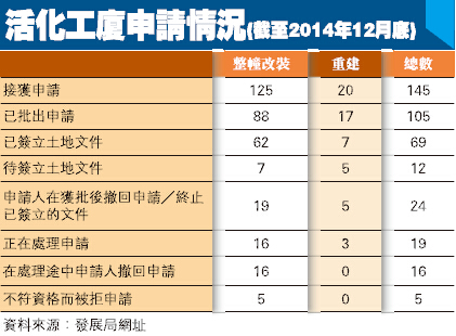 發展局資料指,直至去年12月底止,在這四年多期間,地政總署共接獲145宗申請個案,已批出105個案,扣除24宗申請人在獲批後撤回申請或終止已簽立的文件個案,已批出申請個案的有81宗。細看之下,整幢改裝申請個案最多,有125宗,重建佔餘下20宗申請個案。按類別劃分,整幢改裝批出的申請個案有88宗,重建個案則有17宗。可見業主或發展商較傾向整幢工廈改裝。