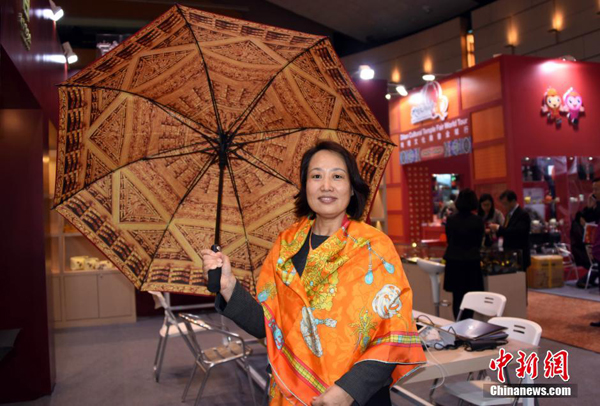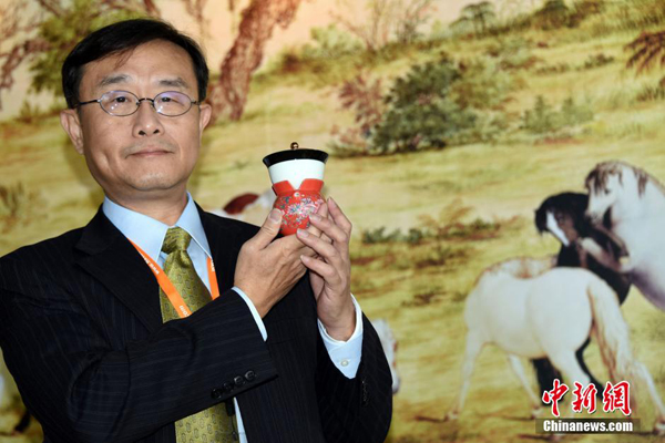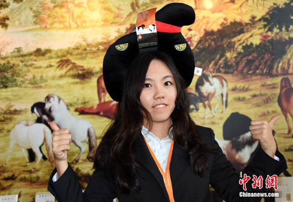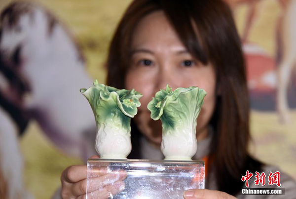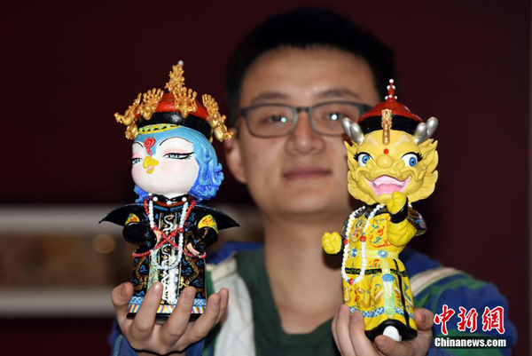 1月13日,北京故宮參展工作人員在香港展示3D列印的故宮吉祥物萌娃“壯壯”和“美美”。當日,由香港貿易發展局主辦、為期3天的第13屆香港國際授權展進入第2個展覽日,展區裡觀眾如潮。海峽兩岸故宮博物院同場“唱戲”,各自亮相、展示精美創意故宮文化衍生商品的展臺前人群熙熙攘攘,吸引著眾多喜愛中華傳統文化的參觀者駐足細賞,流連忘返。孫自法攝