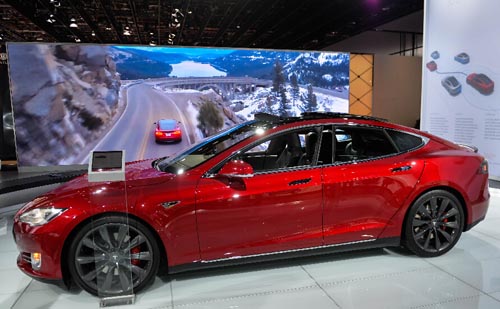 1月13日,在美國底特律舉行的北美國際汽車展上,美國電動汽車公司特斯拉全球副總裁杰羅姆·吉倫與升級版Model S純電動汽合影。