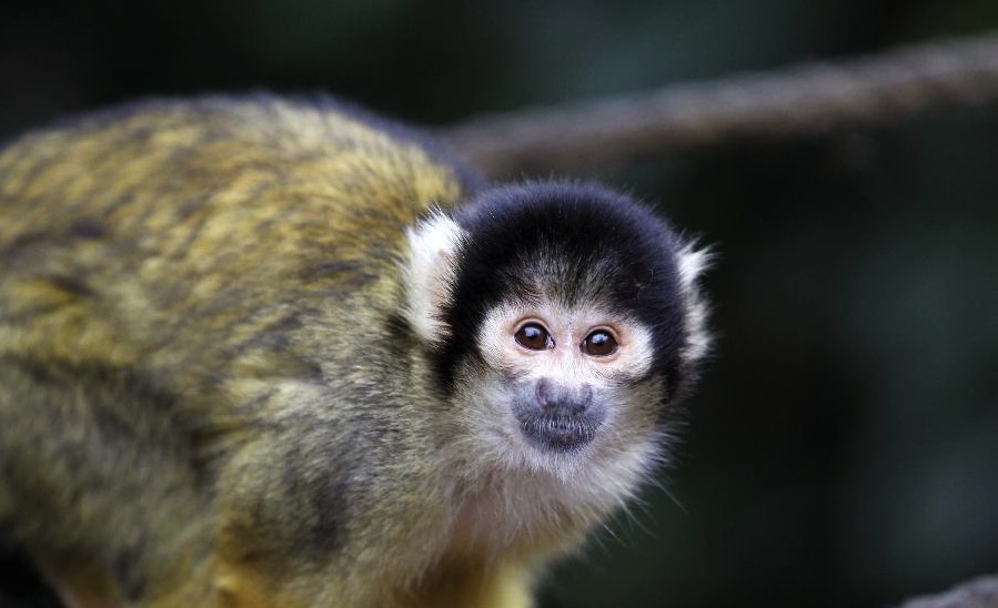 在英国伦敦动物园,黑冠松鼠猴站在绳索上小憩。