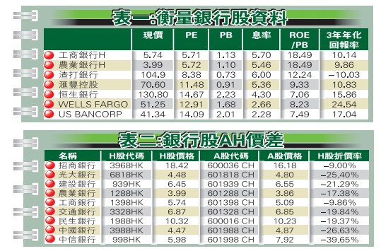 A/H銀行股中H股全部折價(詳見表二),目前而言買H股更佳。港幣人民幣按0.8折算。