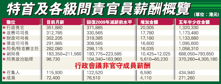 政府前晚11時后宣布,行政長官、一眾問責官員及行政會議成員由2月1日起,薪酬回復至2002年立法會財務委員會批准的水平(詳見附表)。
