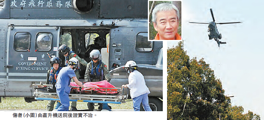 飛行服務隊發言人表示,在昨晨10時16分接獲通知,直升機前往救人,未料期間直升機因故障需要回航,至11時32分再度起飛,8分鐘後到場發現傷者救起,送到屯門醫院直升機坪,沿途醫生觀察傷者傷勢,並陪同送抵急癥室,惟傷者抵院時已被紅布蓋頭,經搶救後由急癥室醫生證實不治。