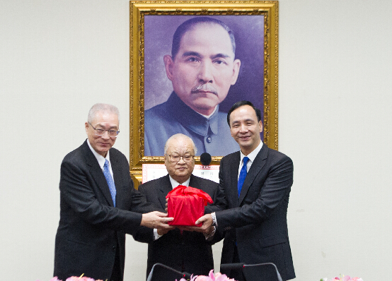1月19日上午,中國國民黨主席就職典禮在位于臺北市的國民黨中央黨部舉行。圖為國民黨代理主席吳敦義(左)向新當選黨主席朱立倫(右)移交印信。 中新社發路梅攝