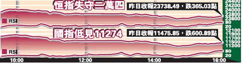 內地股市大跌,港股昨日以裂口24014至23971低開133點,即使收窄跌幅至24045,卻乏力再上,恒生指數1分鐘圖9RSI略高中軸的62.469出現小雙頂,有強烈的技術見頂信號,走低至23770。