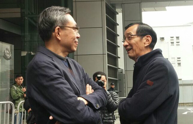 葉一堅(右)與張劍虹(右)在灣仔警總外會面。
