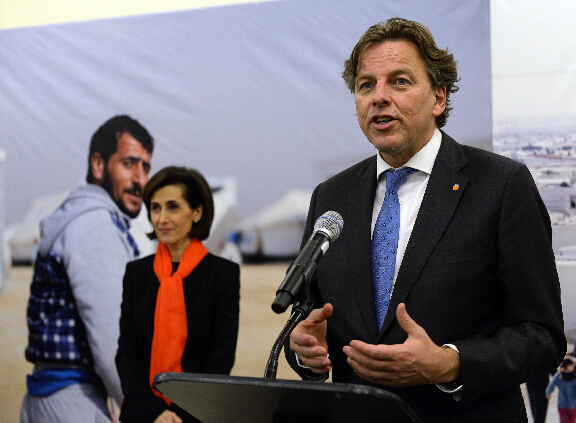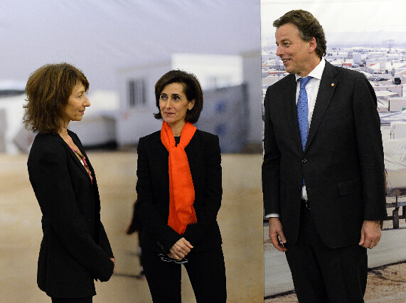 荷蘭外交大臣貝爾特·孔德爾斯(前)和約旦常駐聯合國代表迪娜·卡瓦爾出席札特利(Zatari)難民營圖片展開幕式。