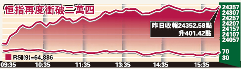 美股持續大幅波動,國際貨幣基金組織下調全球經濟增長預測,利淡大市氣氛;不過內地經濟數據勝預期,以及歐洲央行勢推量寬,科技股表現亦理想,抵銷市場對全球經濟增長放緩的憂慮。內地股市低位反彈,中證監言論利好市場氣氛,帶動大市回升。港股亦跟隨向好,恒指重上24000點水平。由於外圍短期仍反覆,預料短期港股走勢持續波動,恒指將於23800至24500點間上落。