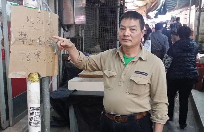 在上水新勤街开设理发店的陈氏夫妇,在店外挂着「此门口不准站立」纸牌,陈先生解释,每天有数以百计水客推着手推车,在多条横街後巷分货,「不单止阻街,内地人四周围吐痰,搞到衞生好差,消防通道又塞满货。」
