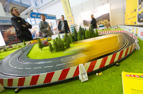 在奧地利薩爾茨堡展覽中心,幾名參展商被展出的玩具車吸引。