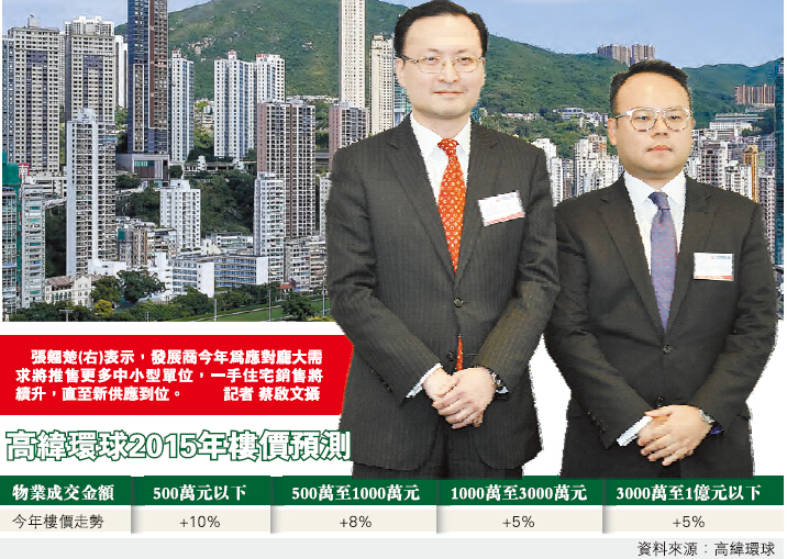 【香港商報网訊】記者劉思桐、實習記者譚之穎報道:2015樓價預警繼續闖高峰!高緯環球昨發布樓市研究指,去年本港一手住宅銷情熾熱,二手市場亦重拾動力,令整體住宅成交按年升26%,而剛性需求亦推動樓價屢次破頂。該行表示,住宅買家預期樓市仍求過於供,外圍持續低息亦可支持樓價,料今年住宅價格將續創新高,中小型單位樓價或升5%至10%。