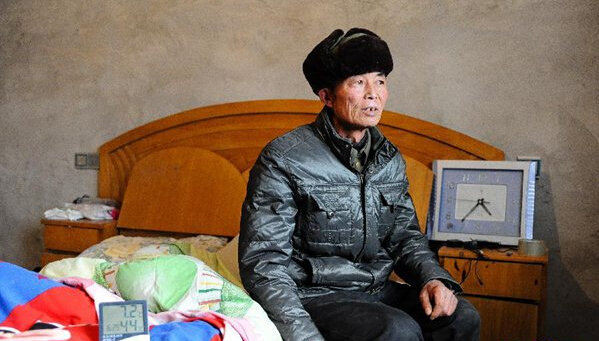 江蘇省淮安市淮陰區袁北村村民尹萬順在家中。尹萬順家沒有取暖設備,白天得穿五件衣服御寒(1月6日攝)。