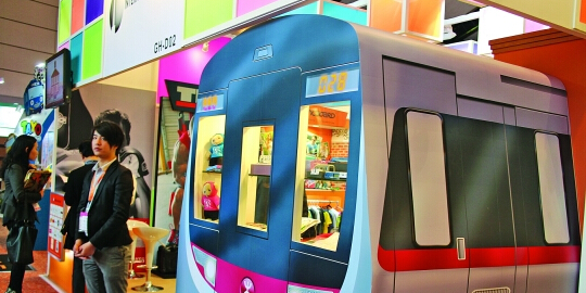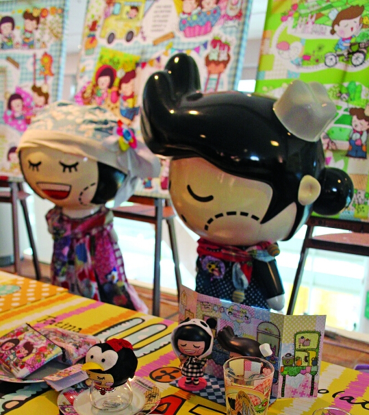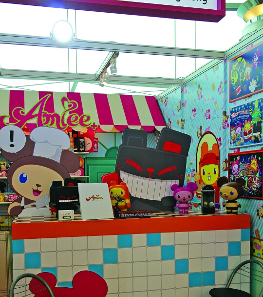 阿貍這次的展位就做成了一個小朋友的臥室,有阿貍的床,床上有阿貍的抱枕,旁邊還掛著阿貍的毛巾和睡衣,墻紙自然也是阿貍的。這樣會不會做夢也夢到阿貍呢?好難講。還有Fatina&Chefo展位,把自家弄成一個每個人都能坐下來聊聊的咖啡吧,甚至連杯子和餐盤都準備好了,當然目的不是為了吃喝,而是宣傳自己。還有A im ee,把自家展位做成了一個廚房的料理臺,兩個卡通形象自己做大廚,忙里忙外,給自己做宣傳。鋼鐵俠也來了,還帶來了一節車廂,不過不是鋼鐵的,而是把自己模擬車頭的部分做成了陳列櫥窗。