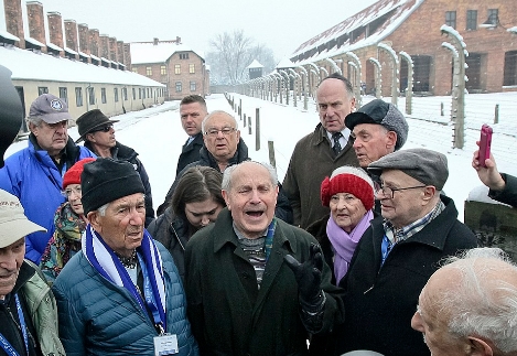 在奧斯維辛集中營解放70周年,一群幸存者舉起並指向自己的照片。