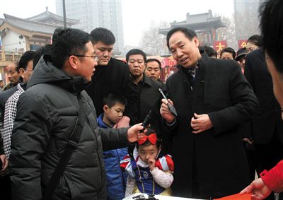 資料圖:2013年2月6日,陝西省書協主席週一波等為市民寫春聯。2014年12月27日,包括週一波在內的8名副廳級以上幹部,不再擔任省書協領導職務。此後,陝西書法協會仍有27名副主席。圖/CFP