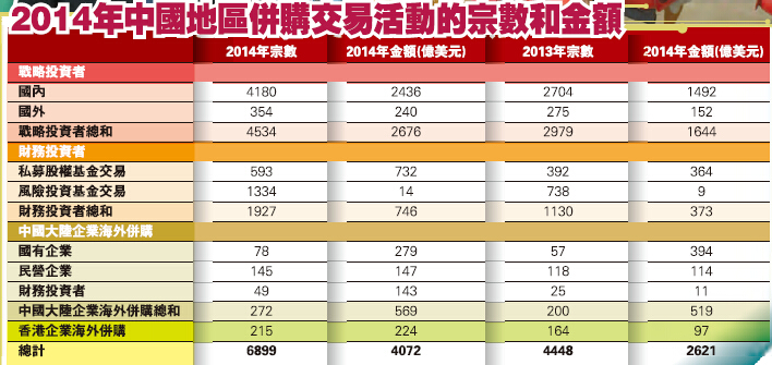 羅兵咸永道在《2014年中國地區企業併購回顧與2015年前瞻》報告中指出,隨著房地產開發商不斷尋找新的資金來源,房地產行業的併購交易金額繼續位列第一;私募股權基金交易創了歷史新高,達730億美元,較2013年增長1.01倍。羅兵咸永道中國大陸及香港企業併購服務主管合夥人鮑德暐(David Brown)表示,去年併購活動表現強勁,反映內地經濟日益成熟,推動行業整合。而境外戰略併購活動,特別在銀行及金融服務行業,亦進行了幾宗大規模併購交易。國企民企海外併購目標不同