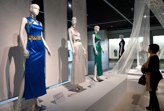 參觀者在河南博物院舉辦的旗袍與時裝藝術展上欣賞旗袍展品。
