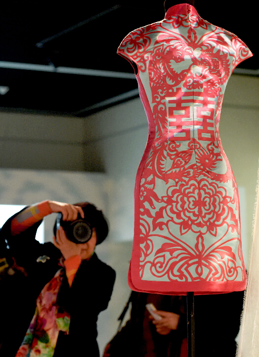 參觀者在河南博物院舉辦的旗袍與時裝藝術展上拍攝旗袍展品。