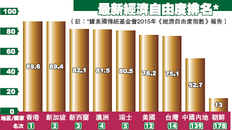 美國傳統基金會日前發表2015年《經濟自由度指數》報告,香港獲得總分為89.6分,連續第21年獲評為全球最自由經濟體。特區政府歡迎傳統基金會連續21年評選香港為全球最自由經濟體,發言人昨表示將堅持自由市場原則,致力提升香港的國際競爭力。