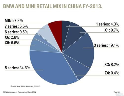 蓋世汽車網曾經整理過寶馬各車型在華銷量占比,以2013年為例,最高的是寶馬5系,達到34.6%,超過三分之一;其次是3系的19.1%;寶馬7系和寶馬X5均占6.6%,尚不及MINI的7.3%,X3的8.2%和X1的9.7%。