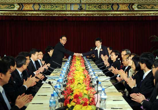 1月29日,兩岸經合會大陸方面召集人、海協會常務副會長鄭立中(左)與兩岸經合會臺灣方面召集人、海基會副董事長施惠芬在會上握手。