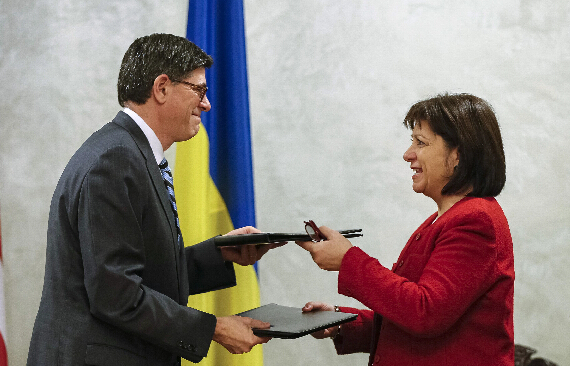 1月28日,在烏克蘭基輔,美國財政部長雅各布·盧(左)和烏克蘭財政部長亞列西科在簽約儀式上交換文件。