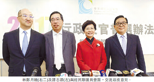 另外,政務司司長林鄭月娥昨日亦偕同譚志源與經民聯會面,聽取他們對政改的意見。林鄭會後表示,經民聯支持在人大8.31框架下,落實2017行政長官普選,又鼓勵政府多與泛民接觸,爭取支持,不要讓政制發展原地踏步。