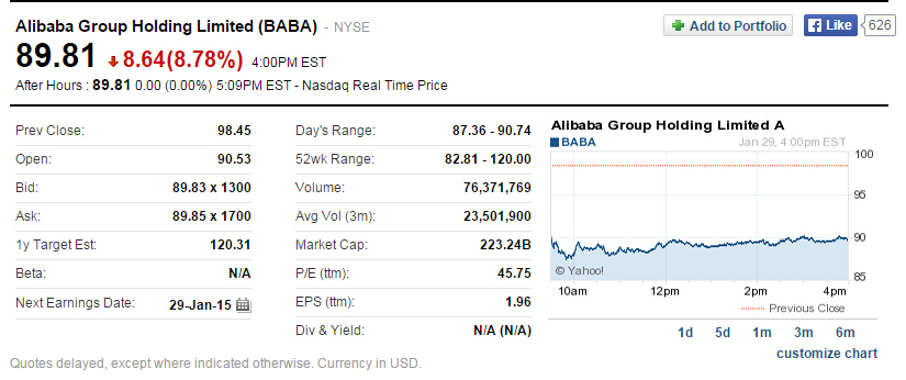 多重因素作用下,阿裡巴巴集團在今日收盤時股價大跌8.64美元至89.81美元,跌幅達8.78%,市值蒸發近215億美元(約合1343億人民幣)。