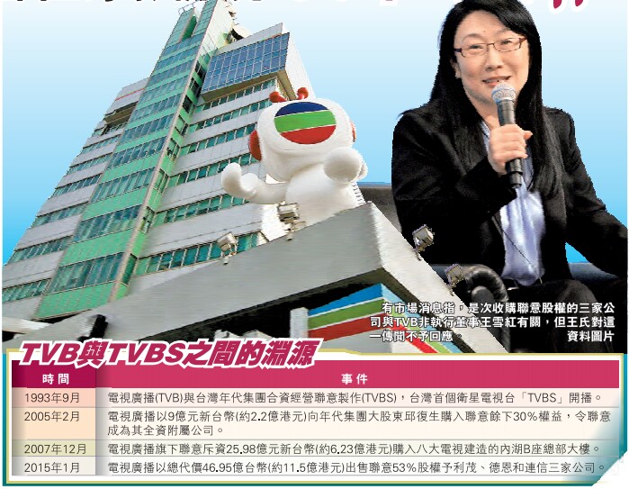 【香港商報訊】記者黃稀爾報道:電視廣播(511)昨宣布,公司將出售聯意制作(TVBS)53%的股權予三家臺灣投資公司,總代價約11.5億元。市場消息指,是項交易的買方或與電視廣播非執行董事王雪紅有關,推測她旨在通過收購聯意全面掌控TVBS。