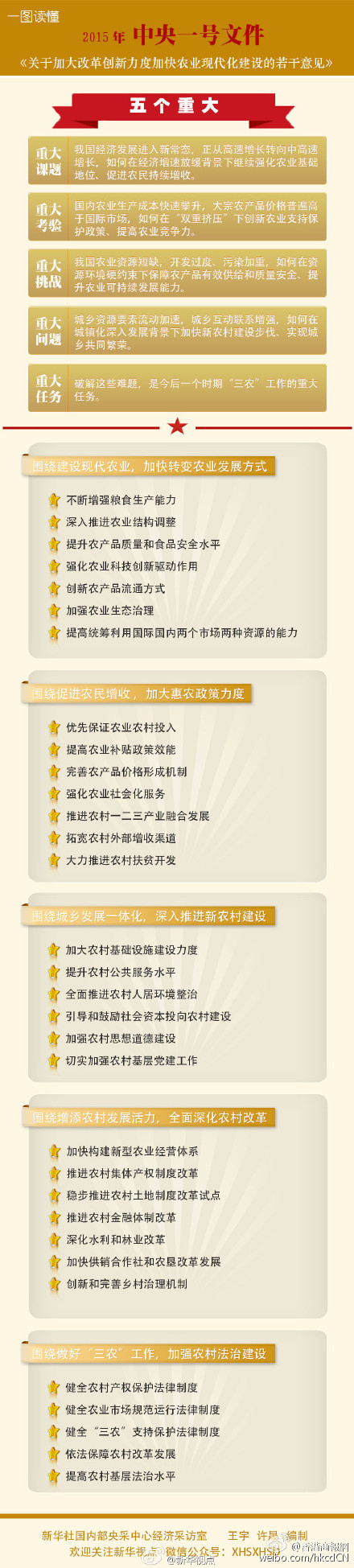 各級黨委和政府要從全面建成小康社會、加快推進社會主義現代化的戰略高度出發,進一步加強和改善對“三農”工作的領導,切實防止出現放松農業的傾向,勇於直面挑戰,敢於攻堅克難,努力保持農業農村持續向好的局面。各地區各部門要深入研究農業農村發展的階段性特征和面臨的風險挑戰,科學謀劃、統籌設計“十三五”時期農村改革發展的重大項目、重大工程和重大政策。加強督促檢查,確保各項“三農”政策不折不扣落實到位。鞏固和拓展黨的群眾路線教育實踐活動成果,堅持不懈改進工作作風,努力提高“三農”工作的能力和水平。