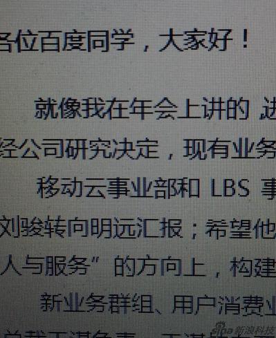 對此,百度確認進行組織調整,通過調整,百度業務將進一步聚焦,公司效率將大幅提升,在移動互聯網時代將為線民提供更好的服務。