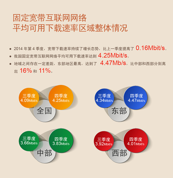 近年來,中國寬頻網路速率整體穩步提升,尤其是東部地區在寬頻基礎設施、寬頻應用、寬頻速率等各方面一直引領我國寬頻的發展。2014年第4季度中國東部地區寬頻下載平均速率達到4.47Mb/s,在東、中、西三個區域中最高,但仍須看到,其距離國際先進水準依然存在著較大差距,在寬頻網路基礎設施建設不斷發展的情況下,中國東部地區的寬頻網速還有進一步大幅提升的空間。東部地區還需要從寬頻網路的各個環節入手,充分發揮引領作用,全面提高寬頻網路速率,必將帶動我國寬頻網路速率整體水準的提升,不斷縮小與發達國家的差距。