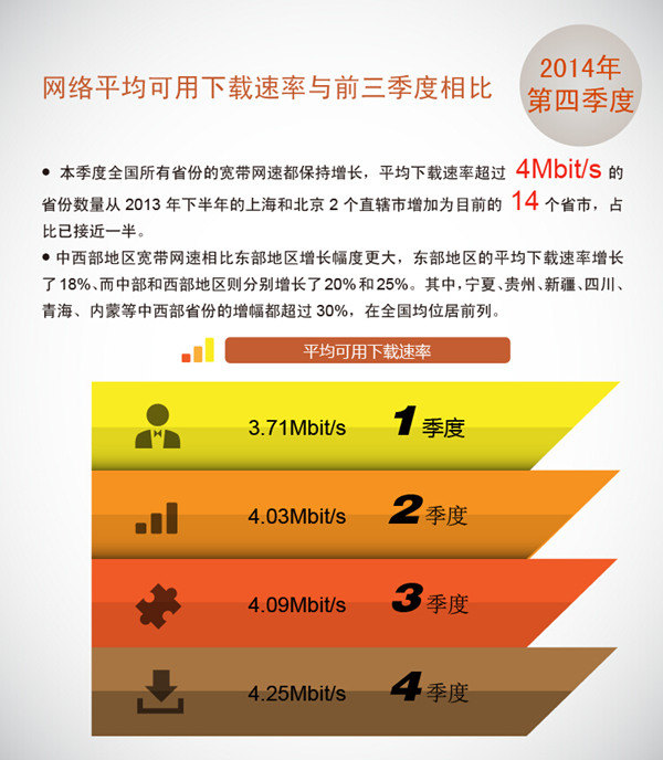 寬頻發展聯盟近期發佈了2014年第4季度《中國寬頻速率狀況報告》,資料顯示,自2013年8月國家實施 “寬頻中國”戰略以來,中國寬頻網速得到了明顯提升,這也充分體現了相關政府部門、基礎電信企業和互聯網企業等各方在推動中國寬頻發展方面所付出的努力。