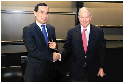 1月31日,安邦保險集團CEO吳小暉與黑石集團董事長蘇世民在哈佛校園招聘會上。