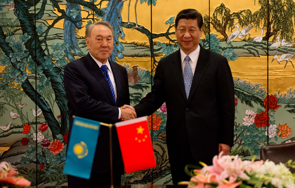 2013年4月6日,习近平主席和哈萨克斯坦总统纳扎尔巴耶夫在海南三亚举行的博鳌经济论坛的一项签字仪式后握手。